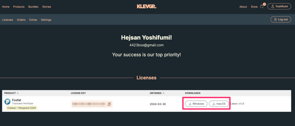 そうすると、Your AccountページでKlevgrand Fosfatをダウンロードできるようになりました。
